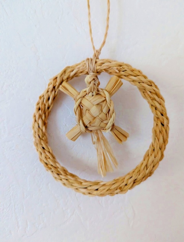 # 開運と魔除けのオーナメント「真菰 精麻 御守り」 幸運を呼び込む力を秘めたオーナメントです。 この「真菰 精麻 御守り」は、厳選された真菰と精麻を使用し、亀としめ縄の美しいデザインが特徴です。自然の力を凝縮した真菰と、強いエネルギーを持つ精麻が融合し、あなたの運気をアップさせ、魔を寄せ付けないサポートを提供します。 この御守りは、開運やしあわせを願う方にぴったりで、家庭や職場、様々な人間関係であなたを支えます。真菰のエネルギーが心をリフレッシュし、精麻が環境を整える効果が期待できるでしょう。 また、亀は長寿と繁栄の象徴として多くの人に愛されています。しめ縄は神聖な空間を作り出し、魔除けの役割を果たします。この美しいオーナメントは、お部屋のインテリアや車内のお守りとしても華やかさを演出してくれます。 自分用はもちろん、家族や友人への贈り物にも最適です。自然のエネルギーと伝統的なデザインが調和した「真菰 精麻 御守り」を、ぜひ手に取っていただきたい逸品です。 [お手入れ方法] 直射日光を避け、湿気の少ない場所で保管してください。 内容量 1個 長さ 30センチ、幅 28センチ 真菰、精麻、亀、しめ縄、開運・魔除け効果