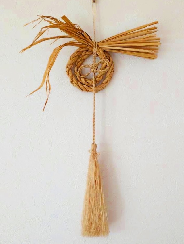 # 開運としあわせのオーナメント「オーナメント 真菰 精麻 御守り」 豊かさを呼び込む力を秘めたオーナメントです。 この「オーナメント 真菰 精麻 御守り」は、厳選された真菰と精麻を使用し、しめ飾りと水引の美しいデザインが特徴です。真菰の持つ自然のエネルギーと、精麻の強い力が融合し、あなたの運気を向上させ、しあわせを呼び込むお手伝いをします。 この御守りは、開運やしあわせを望む方に最適で、家庭や職場、さまざまな人間関係で支えとなります。真菰のエネルギーが心をパンパンに満たし、精麻が空間を整えるパートナーになってくれるでしょう。 さらに、しめ飾りは神聖なエネルギーの象徴であり、魔除けの役割を果たします。水引は結びつきを強め、願いを叶える象徴として多くの人々に親しまれています。この美しいオーナメントは、インテリアとしても華やかな存在感を放ち、毎日の生活にエネルギーを与えてくれるでしょう。 お正月にしめ飾りとして飾った後は、玄関の内側やお部屋に飾ることで、結界を張り悪い氣が入らないようにしてくれます。 自分用はもちろん、大切な家族や友人への贈り物としてもぴったりです。自然のエネルギーと伝統的なデザインが調和した「オーナメント 真菰 精麻 御守り」を、ぜひ手に取ってその魅力を感じていただきたい逸品です。 [お手入れ方法] 直射日光を避け、湿気の少ない場所で保管してください。 内容量 1個 長さ 35センチ、幅 25センチ 真菰、精麻、しめ飾り、水引、開運・しあわせ効果